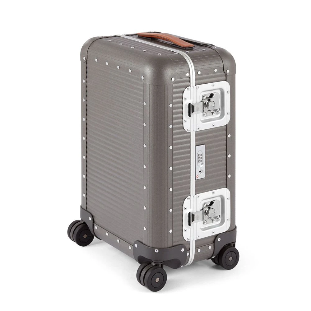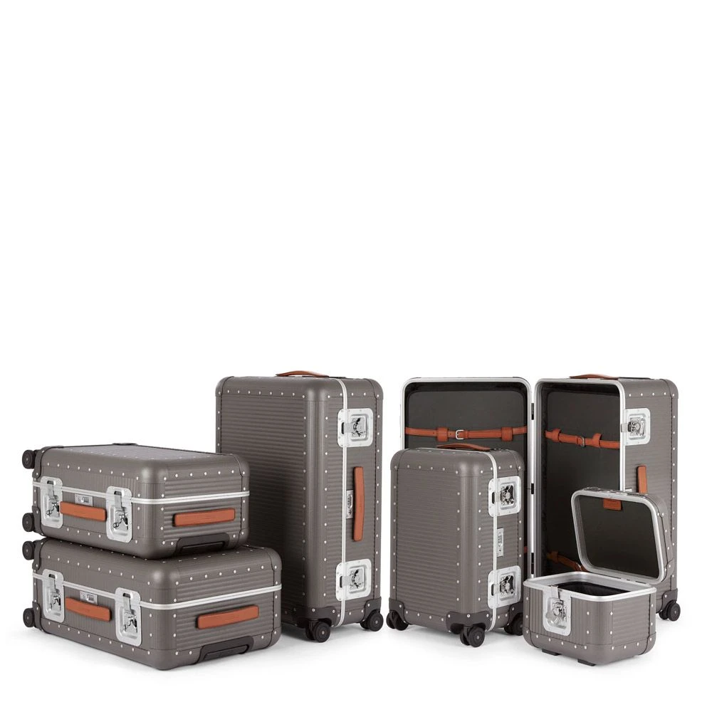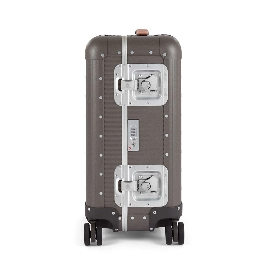The suitcase has a top handle in soft leather and a non-slip rubber service handle on the side.